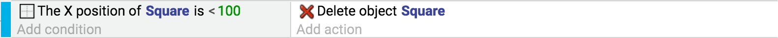 Aquí hay un evento que destruirá el objeto "Cuadrado" cuya posición X es inferior a 100 píxeles:
