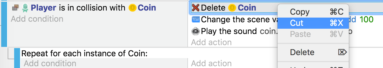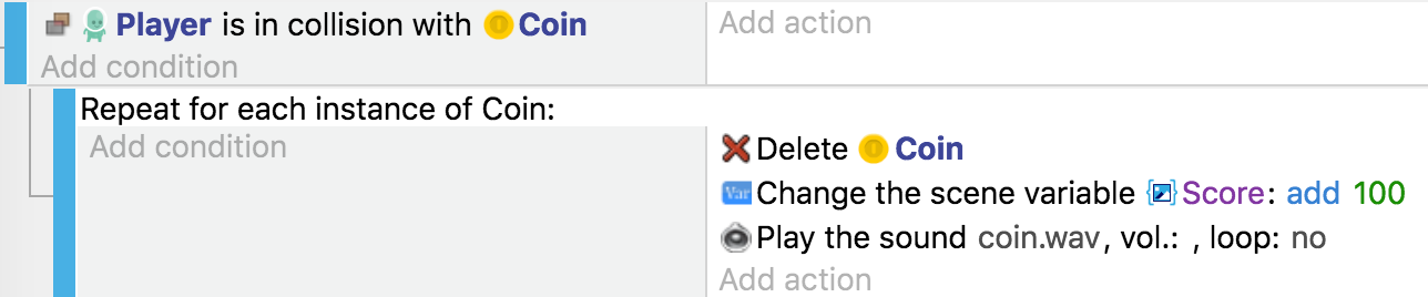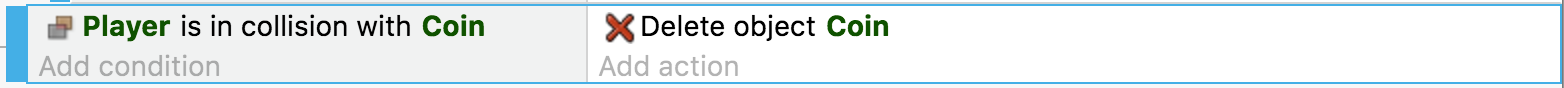 A continuación, puede agregar una acción que eliminará la moneda. La acción solo utilizará los objetos de Monedas que se hayan recogido en la primera condición, por lo que solo se eliminará la moneda que chocó con el jugador.