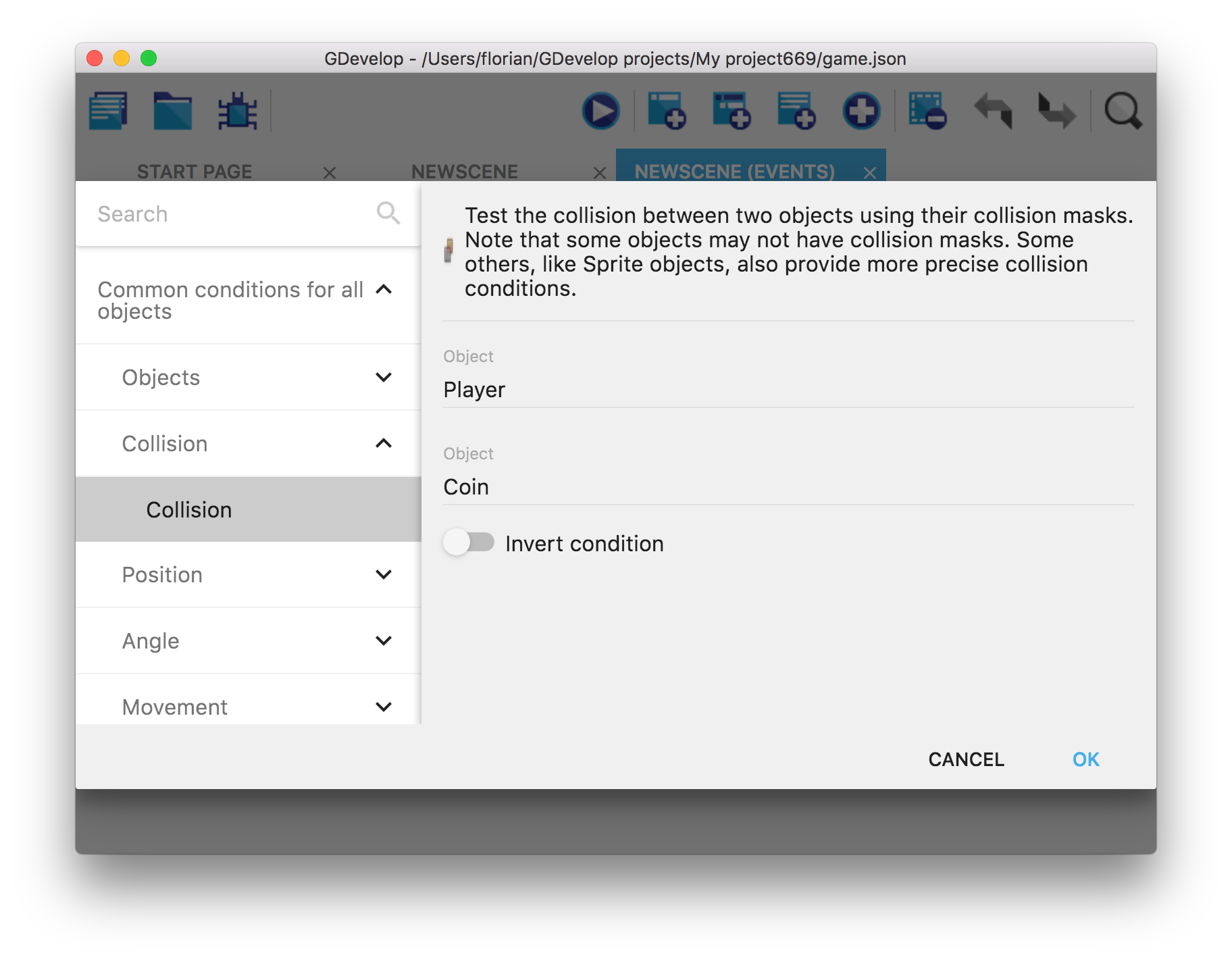 Ahora, destruyamos el objeto de la moneda cuando el jugador los toca. Agrega un nuevo evento y agrega una condición. Elija la condición para probar una colisión entre dos objetos. El primer objeto debe ser "Jugador" y el segundo objeto debe ser "Moneda":