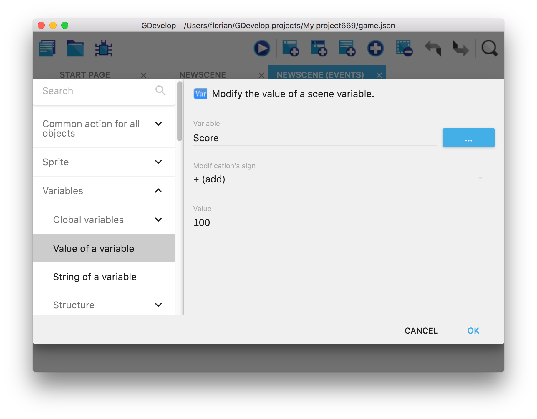 En GDevelop no necesitamos declarar variables antes de usarlas, podemos usar cualquier variable sin declararla simplemente nombrándola en una acción o condición. En caso de que estemos usando una acción en una variable que no está declarada, GDevelop la creará automáticamente para nosotros, con el valor predeterminado de '0' (o un texto vacío) después de ejecutar la acción en la variable para evitar cualquier problema. .
