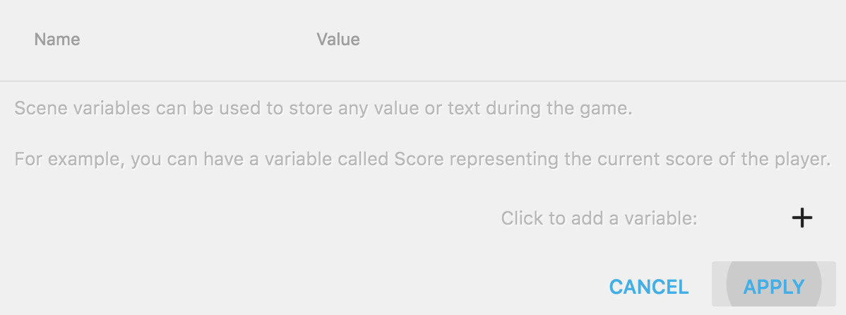 Pero, para tener una mejor organización de su juego, es una buena práctica declarar variables antes de usarlas. De esta manera, es más fácil encontrar qué variables estás usando en tu juego. También puede cambiar su valor predeterminado si desea que sea diferente a 0. Para declarar una variable, haga clic en el botón "..." a la derecha del nombre de la variable. Esto muestra la lista de variables: