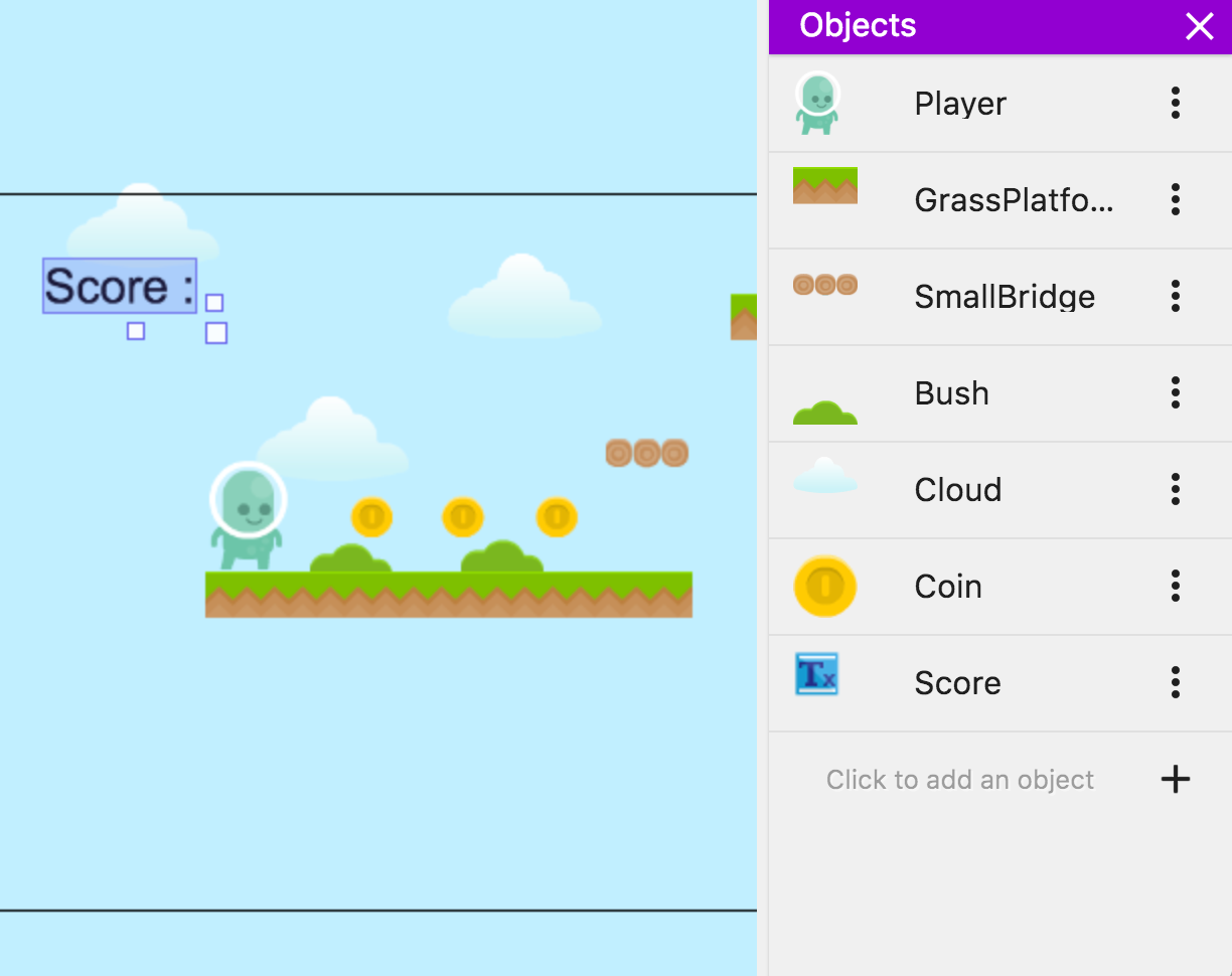 Es posible que haya notado que si recolecta dos monedas al mismo tiempo (por ejemplo, si dos monedas se superponen), el puntaje solo aumenta una vez. Por ejemplo, si cada moneda vale 100 puntos y acumulas 2 monedas, la puntuación solo aumentará a 100 en lugar de 200. La solución para esto es fácil y es algo que aún no hemos visto: vamos a utilizar un evento llamado para cada objeto. Lo que haremos es decirle al motor que por cada moneda que se recolectó, agregue 100 a la puntuación.