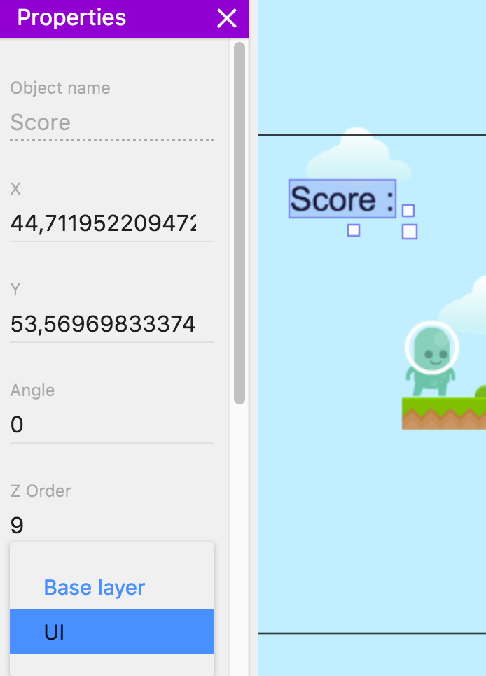Finalmente, mueva el objeto de texto a esta nueva capa seleccionando la instancia de texto en la escena y en las propiedades de la izquierda, seleccione la capa de interfaz de usuario:
