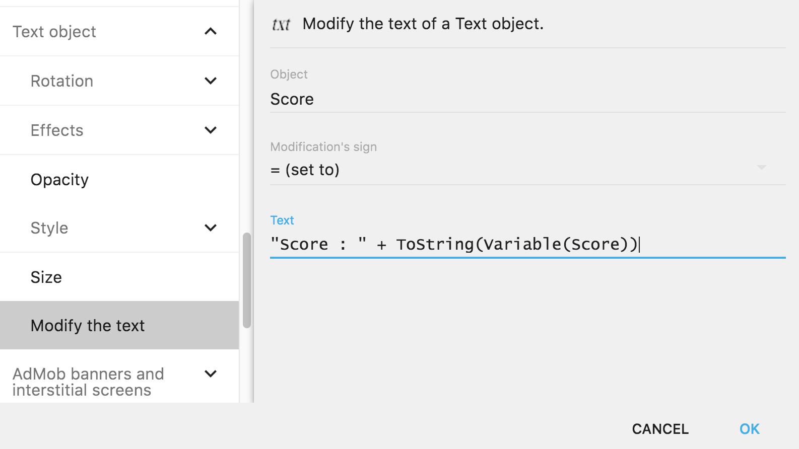 Para el primer parámetro, elija el objeto "Score", ya que es este objeto el que queremos actualizar. Para el segundo parámetro, elija el operador "= (establecido en)" (queremos configurar el texto en un nuevo valor). Finalmente, el último parámetro representa el nuevo contenido del texto. Es una expresión de cadena que GDevelop evaluará durante el juego cuando se ejecute la acción.