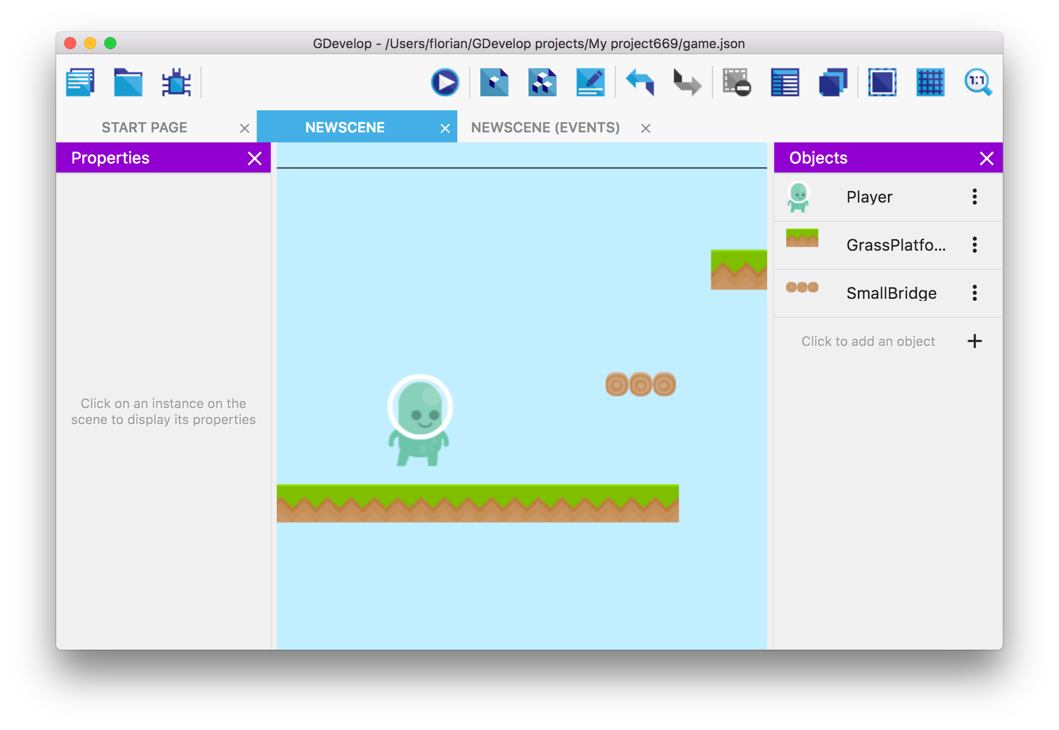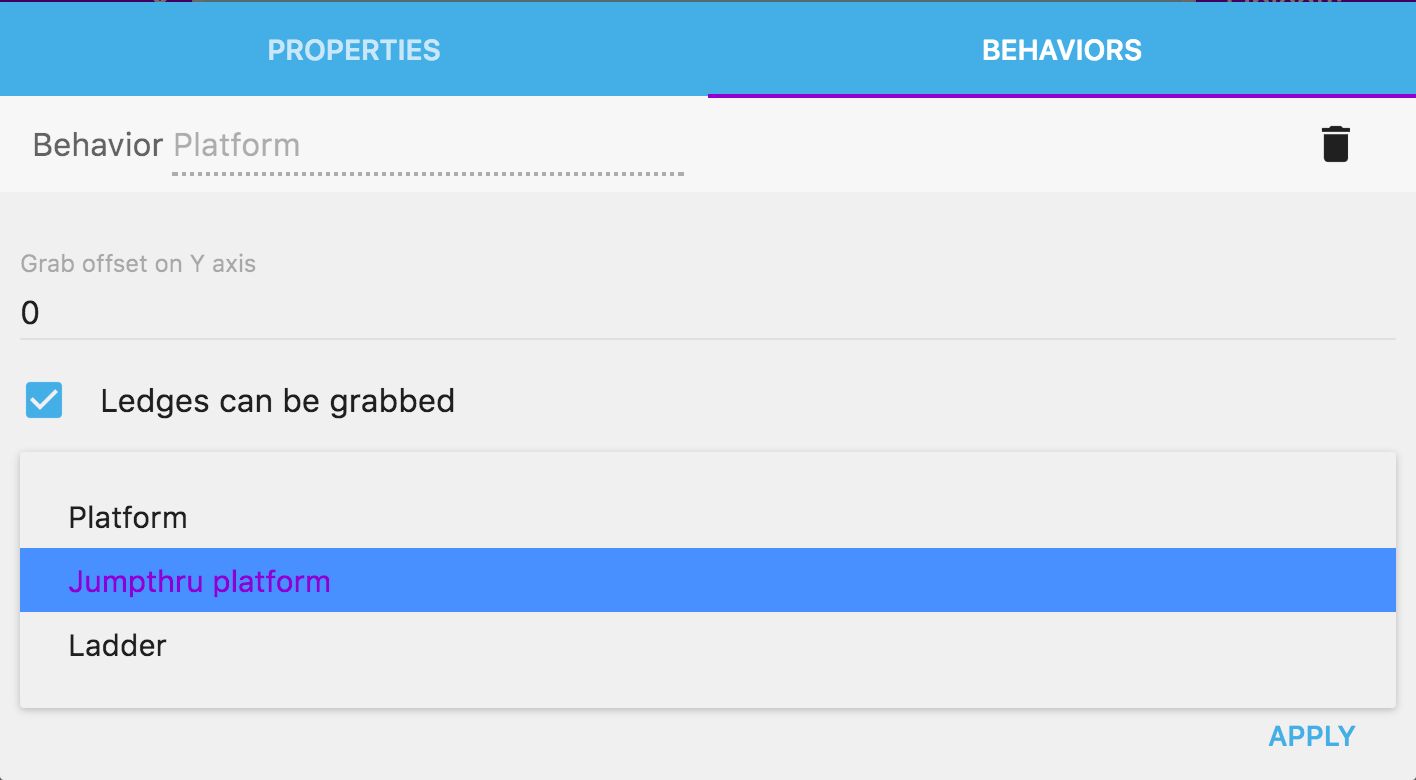 Pour le moment, l'objet n'est pas considéré comme une plate-forme. Ouvrez l'éditeur d'objet (clic droit sur le nom SmallBridge puis sur Edit Object et activez l'onglet Behaviors dans l'éditeur. Ajoutez le comportement appelé Platform puis sélectionnez Jumpthru Platform dans la liste qui s'ouvre lorsque vous cliquez le champ Type