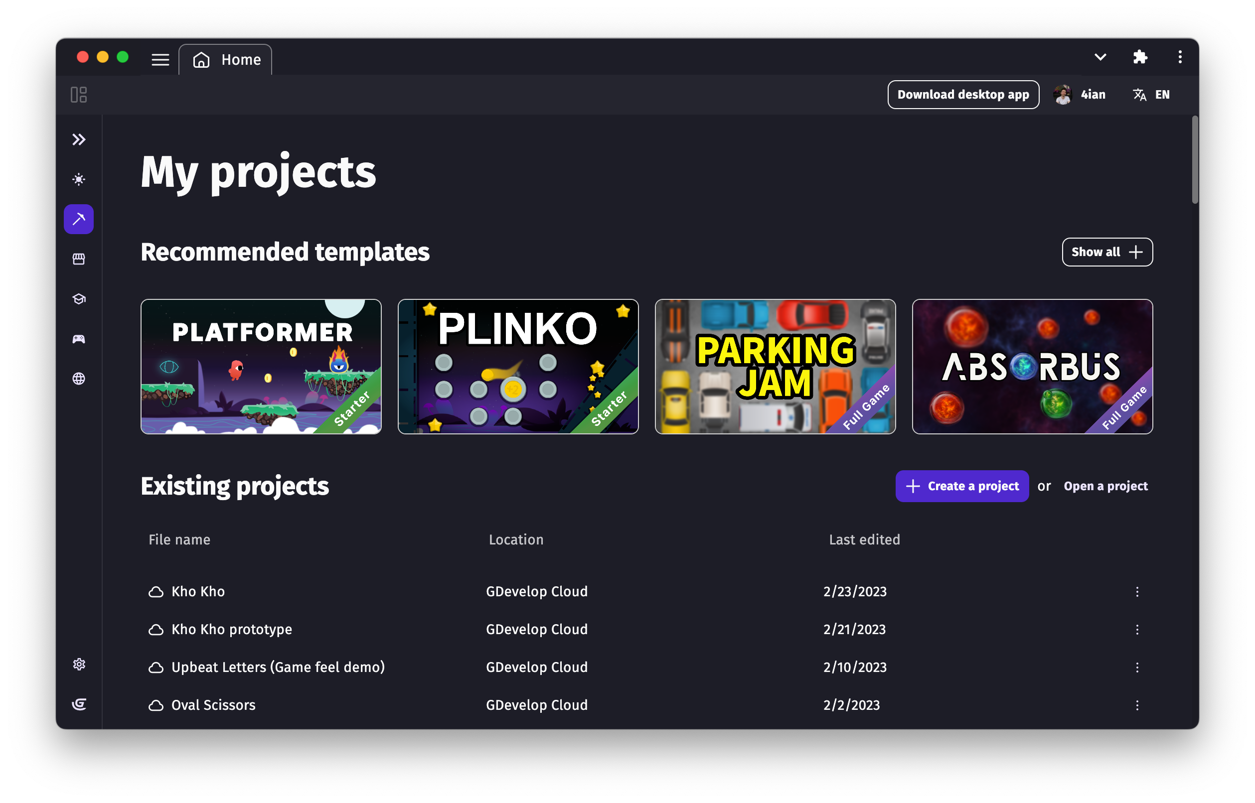 The Home Page is displayed when you first launch GDevelop. From the Home Page you can create your projects, load previously saved projects, or load tutorials.