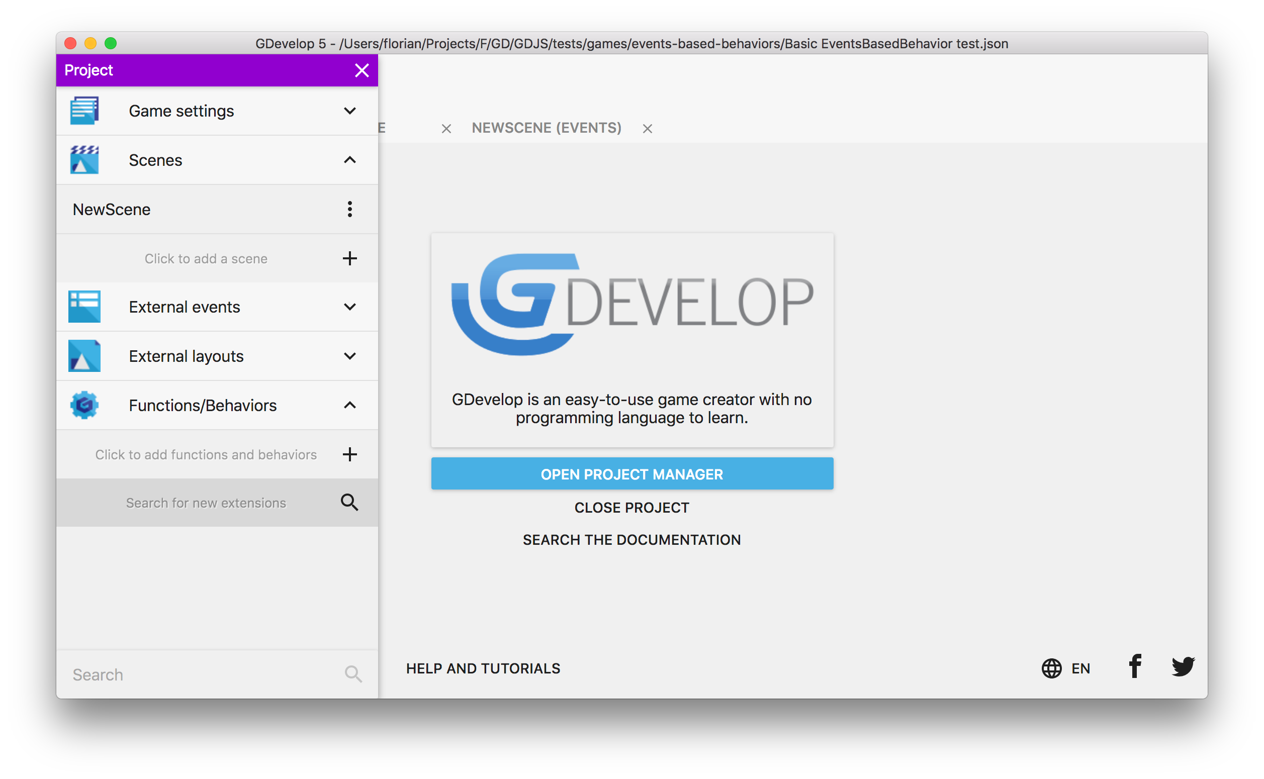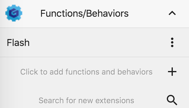 GDevelop でゲームのために新しいビヘイビア、条件、アクション、式を探すのは簡単です。プロジェクトマネージャーで[関数 / ビヘイビア]をクリックし、[新しい拡張機能を検索する]を選びます。