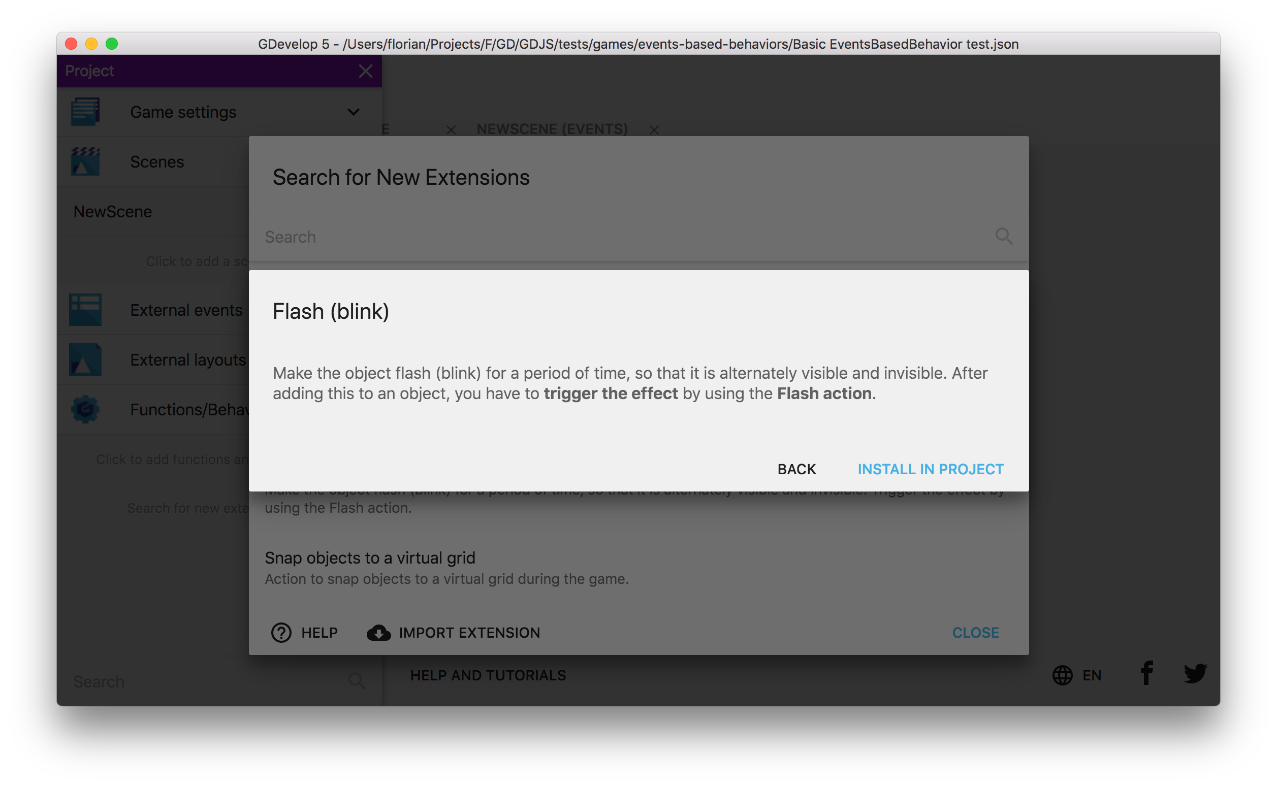 プロジェクトにインストールをクリックすると、拡張機能がダウンロードされます。完了すると、プロジェクトマネージャーの関数/ビヘイビアリストに追加された機能が表示されます。