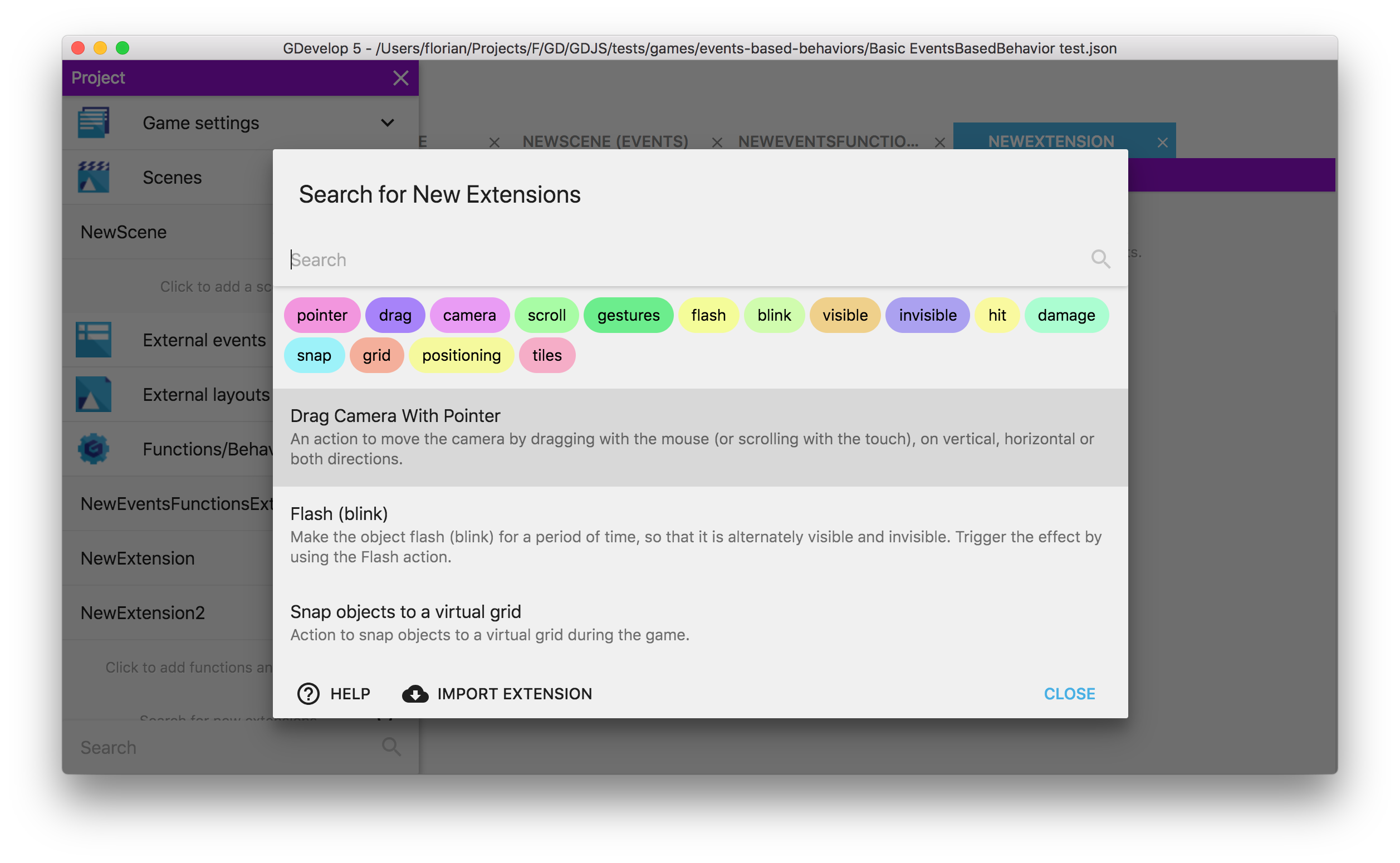 いまシーンで使用しているイベントをそのまま使って、簡単に新しい拡張機能を作成できます。これはゲームを体系化してオブジェクトを拡張する、実に強力な機能です。