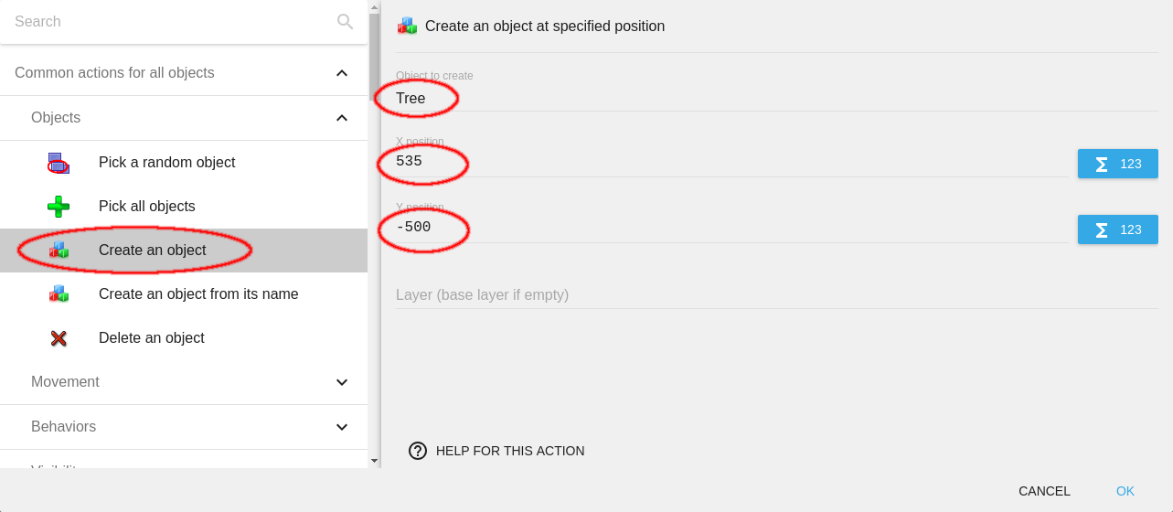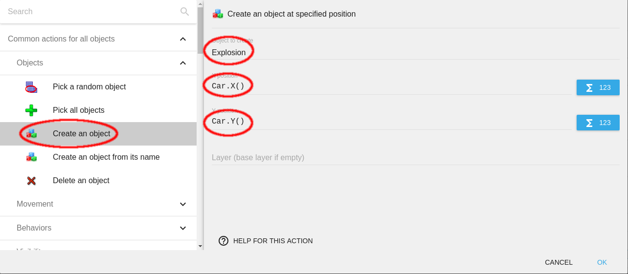 In case of this condition being true, we need to create an object Explosion. You can use the action Create an object and fill Explosion in the Object to create field.