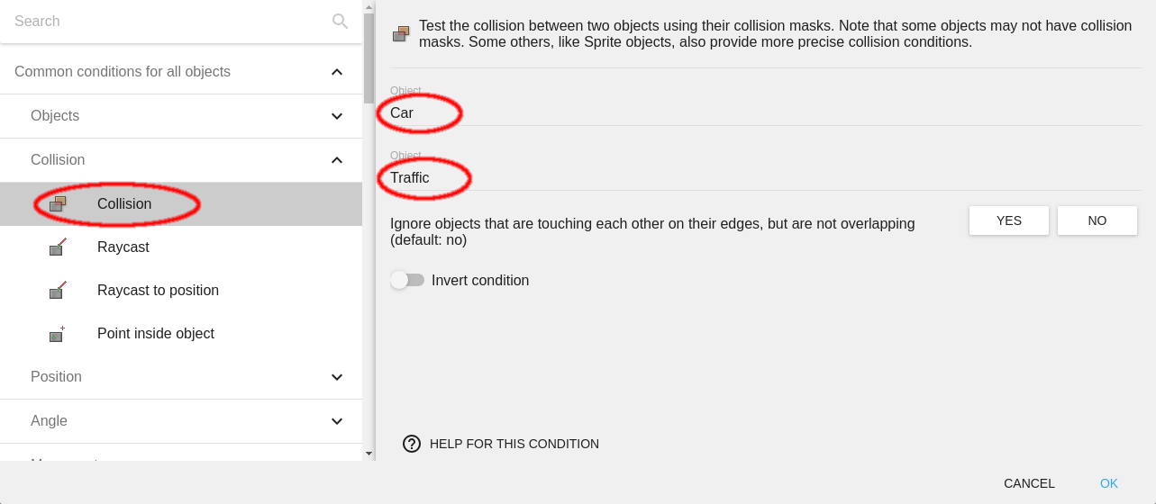 Now, we need to set how the game behaves when there's a collision between Car and Traffic.