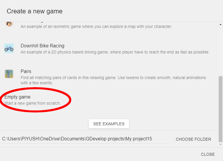 空のゲームと表示されるダイアログボックスで(このオプションを見つけるには下にスクロールする必要がある場合があります)を クリックし、プロジェクトを保存する場所を選択します。