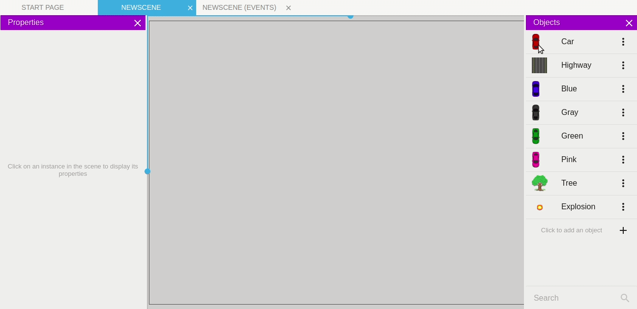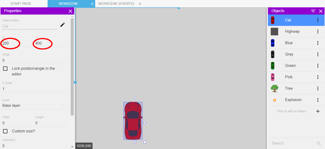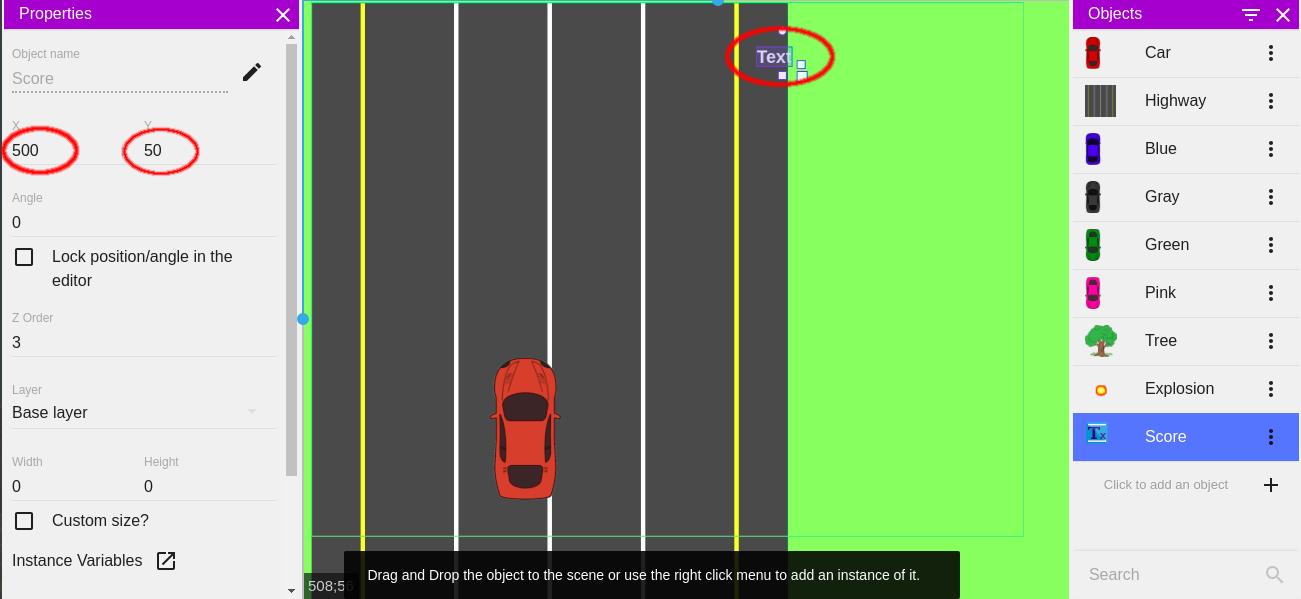 Similarly, to create an instance of Highway you can drag and drop the object to the scene and set its X and Y-coordinates.