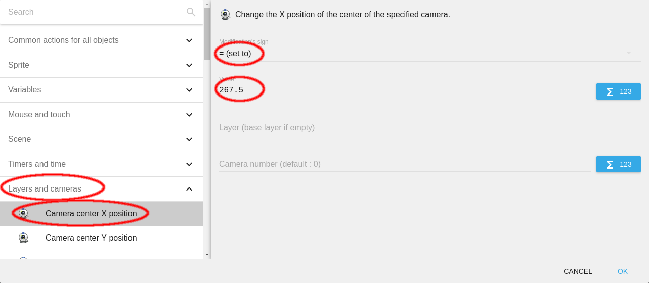 For example, to change the position of the camera, you can go to Layers and Cameras followed by Camera center X position. The right part of the window will now display configurable parameters.