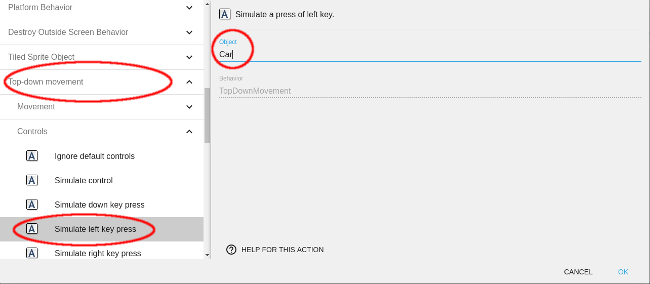 For the action, when the left key is pressed, the Car should have a movement on the left side. This can be easily done using an action Simulate left key press that would simulate the left side movement for the object selected (Car).