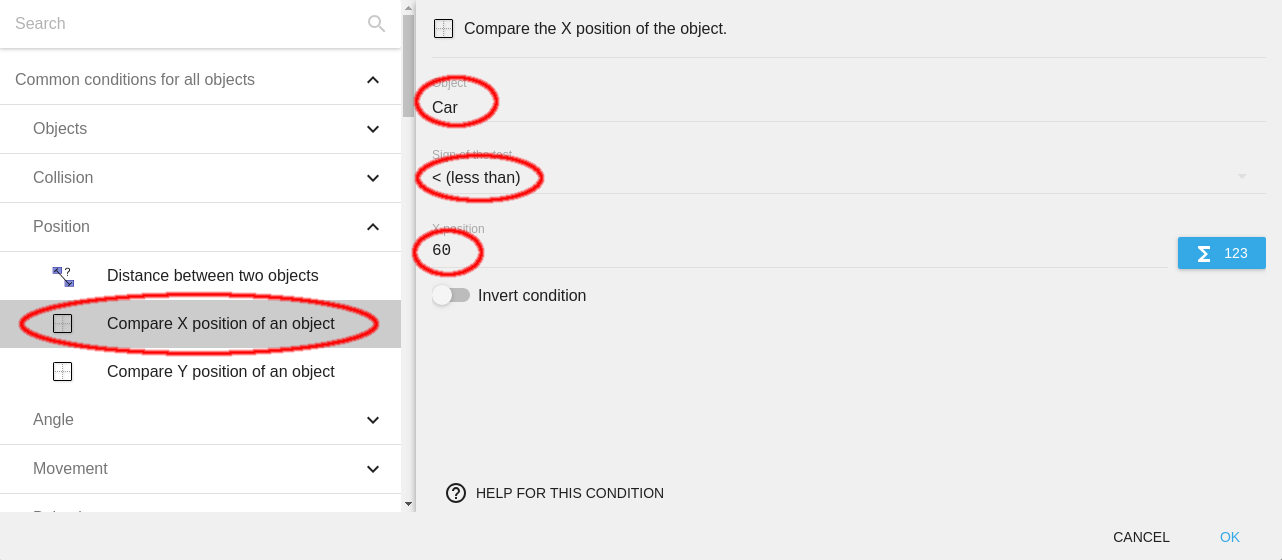 Our first event will include a condition that checks if the X position of the Car is less than 60 px.