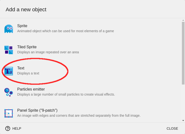 続いて「新しいオブジェクト」ダイアログウインドウがポップアップするので、「スプライト」を選択します。