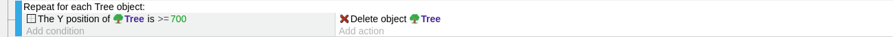 The condition of the event will be to check if Y position of Tree is more than 700 while the action would be to delete the object Tree.