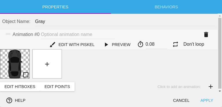 オブジェクトにアニメーションを追加しましょう。アニメーションには、スプライトオブジェクトの画面に表示される画像が含まれています。