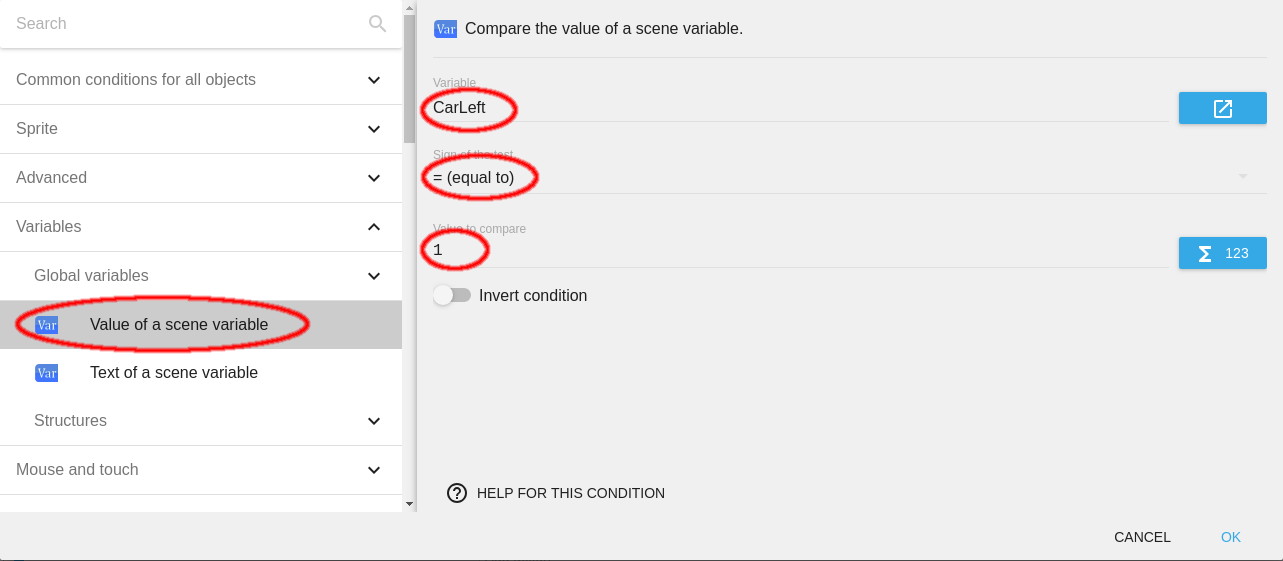 In the condition of the sub-event, we will check if the value of CarLeft is equal to 1. To do this, we will add the Value of a scene variable condition. Enter the variable name CarLeft in the Variable field, set the Sign of the test to = (equal to) and fill '1' in the Value to compare field.