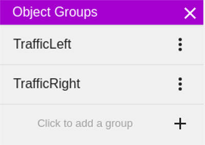 To rename the group name, click on the three-dot-menu or right click on the object group name and choose "Rename". We will name the group TrafficLeft. Now add another group and rename it to TrafficRight.