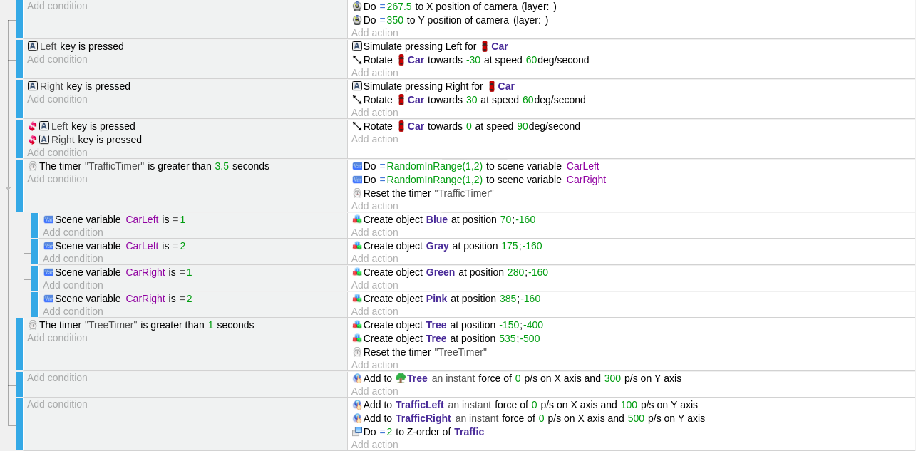To move the traffic cars, we can add events with no conditions and add a vertical force. But if we try to do it in a way similar to what we did for Tree, we will have to add these events for each and every car individually. To simplify this, we can use the Object Groups feature provided by GDevelop.