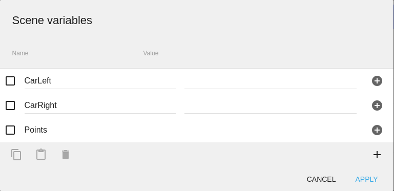 Our action will be to create and change the value of a scene variable. Create a new scene variable Points similar to how we created variables CarLeft and CarRight.