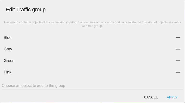 Click on the Choose an object to add to the group field and choose the object Blue followed by Gray and click APPLY. This object group represents the cars on the left side of the highway.