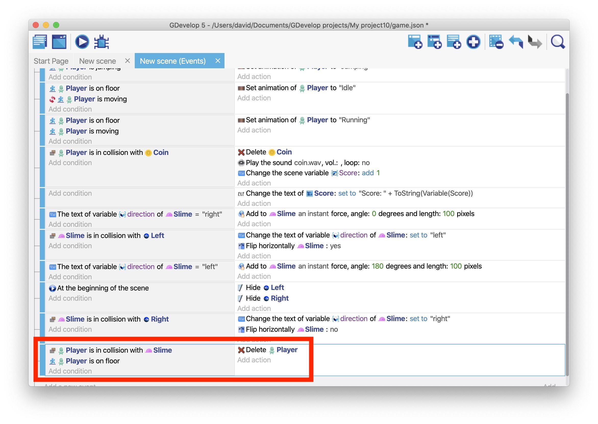 - Voeg een Collision conditie toe die kijkt of het "Player" object botst met het "Slime" object.