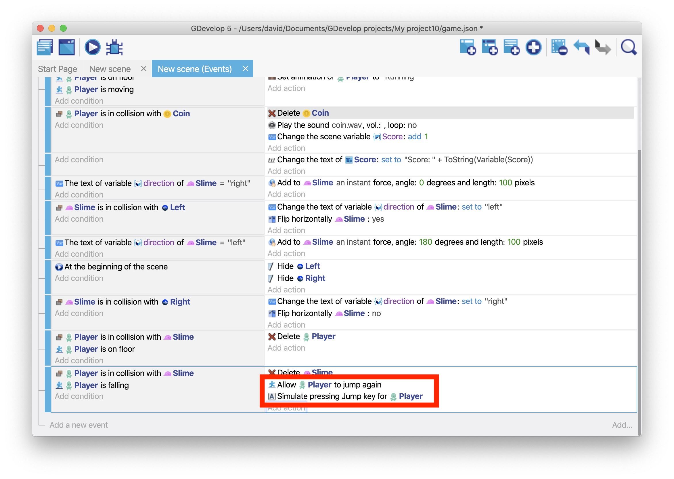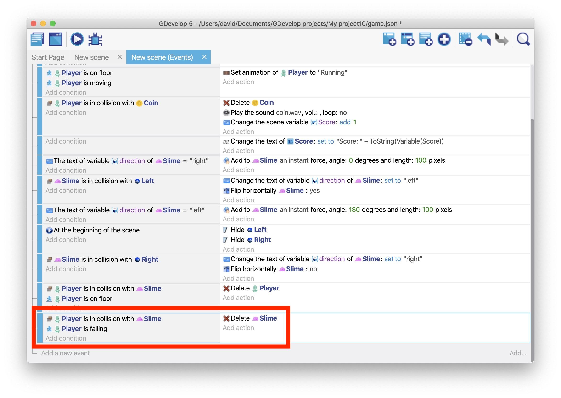 - Add a Collision condition that checks if the "Player" object is colliding with the "Slime" object.