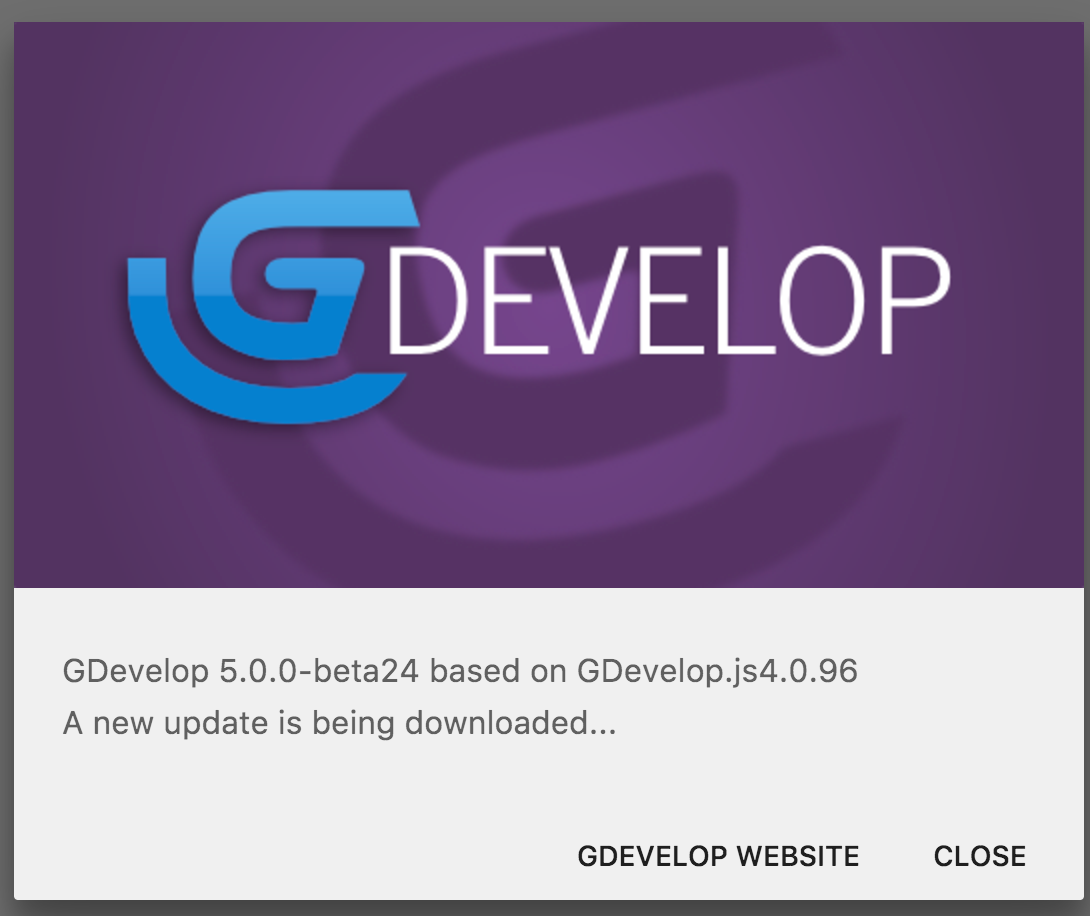 При запуске, GDevelop автоматически ищет новые обновления. Вы можете увидеть процесс нажав About GDevelop на стартовой странице или в меню.