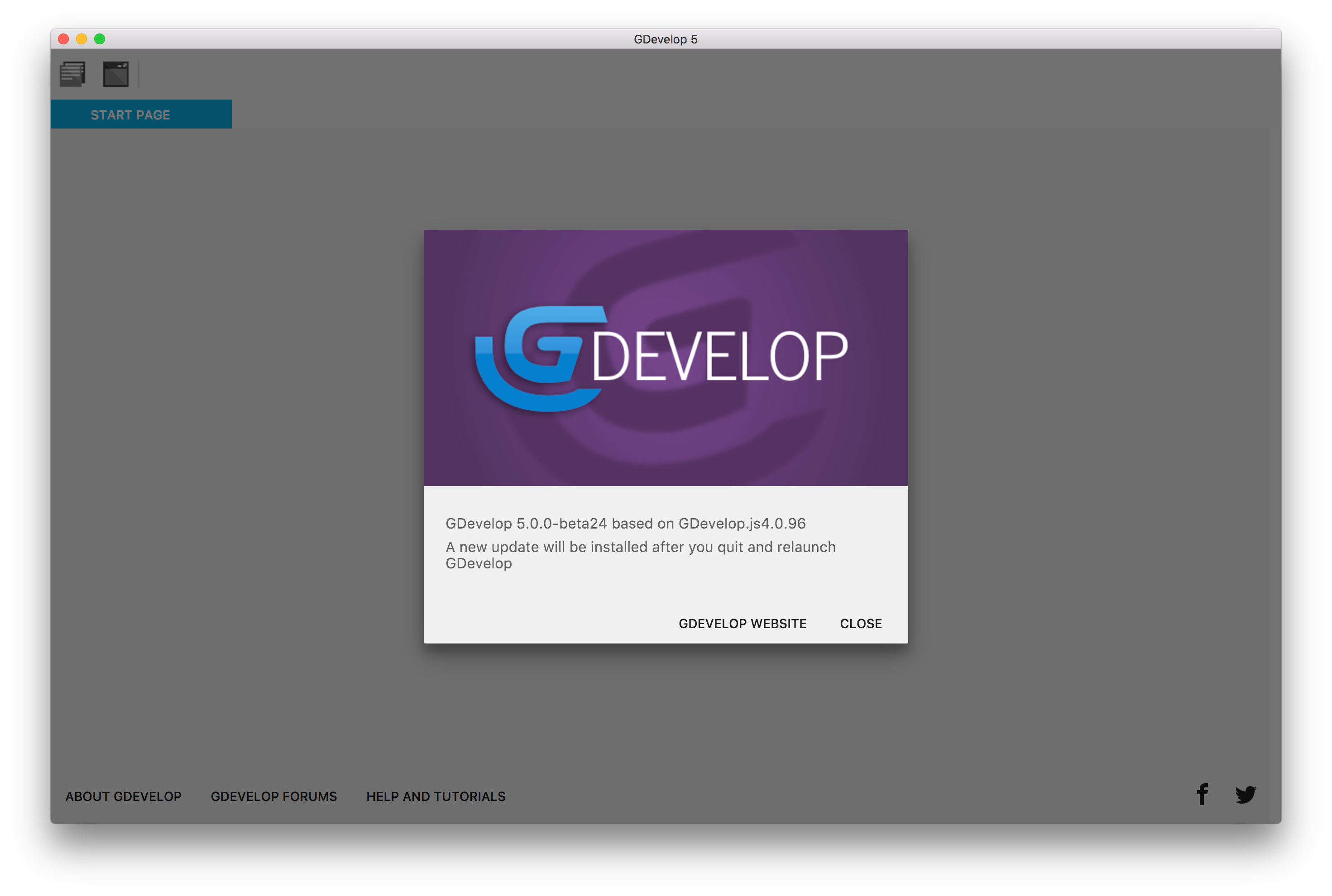 Теперь можно закрыть GDevelop и открыть его снова: все обновления будут установлены. Снова проверьте окно About, вы увидите обновленный номер версии.