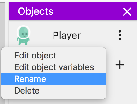 为了非常容易地在游戏中引用对象, 给他起一个名字而不使用默认名字. 在其上鼠标右键(或者点击 图标) 选择“重命名”.然后你可以输入 "Player" 并在屏幕的任意位置点击一下或者按下回车键给这个对象改名.
